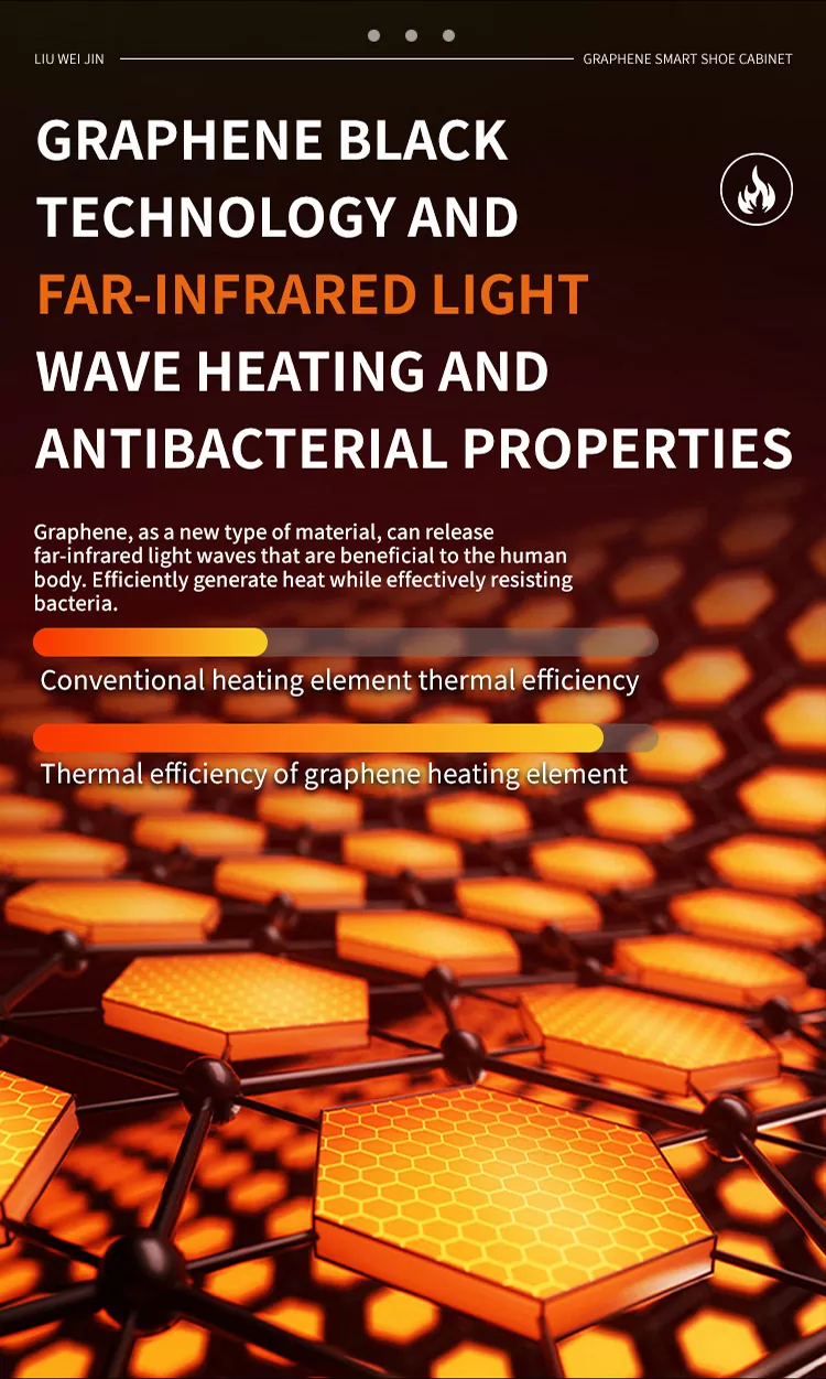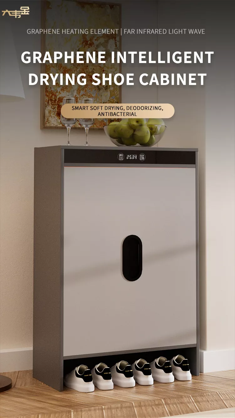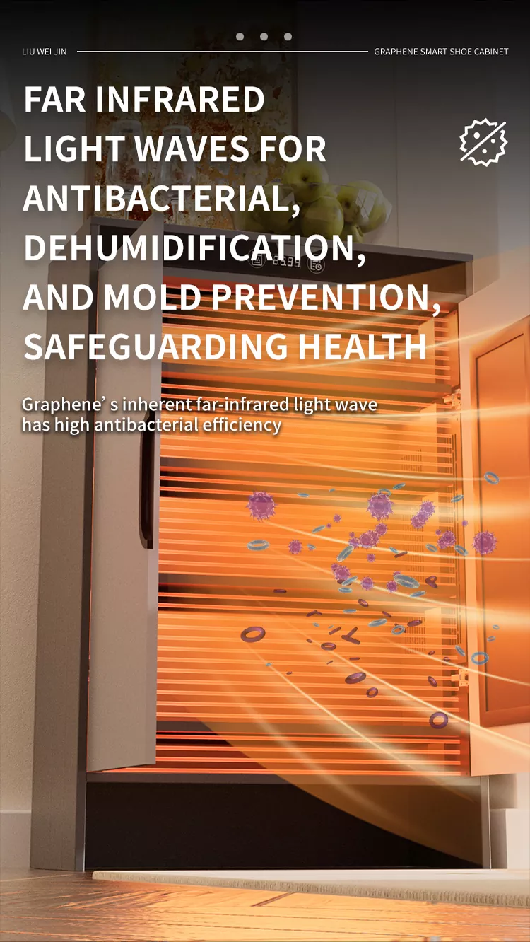 See Liuwei Jinshi grafeeni elektrilise kuumutamise ajastuse kuivatamise kingakapp kasutab intelligentse ajastuse toetamiseks grafeeni kütteelementi ja alumiiniumkapi korpust. Suurus on kohandatud ja laminaat on reguleeritav. Grafeeni soojuselement vabastab kaugelt infrapuna valguse, et tõhusalt vastu panna bakteritele, desodoreerida ja kiiresti kuivada. Lisaks on lõhnade kõrvaldamiseks ioonide puhastusmoodul.