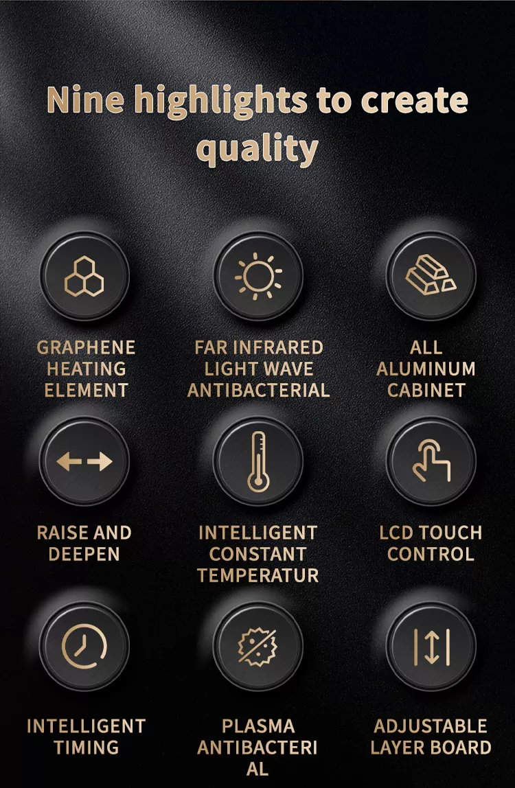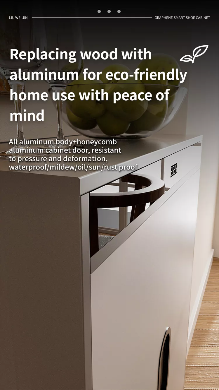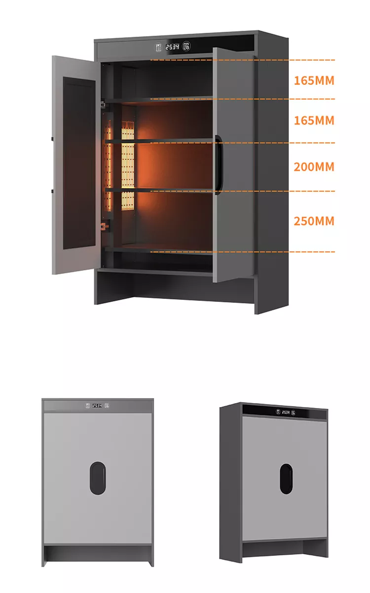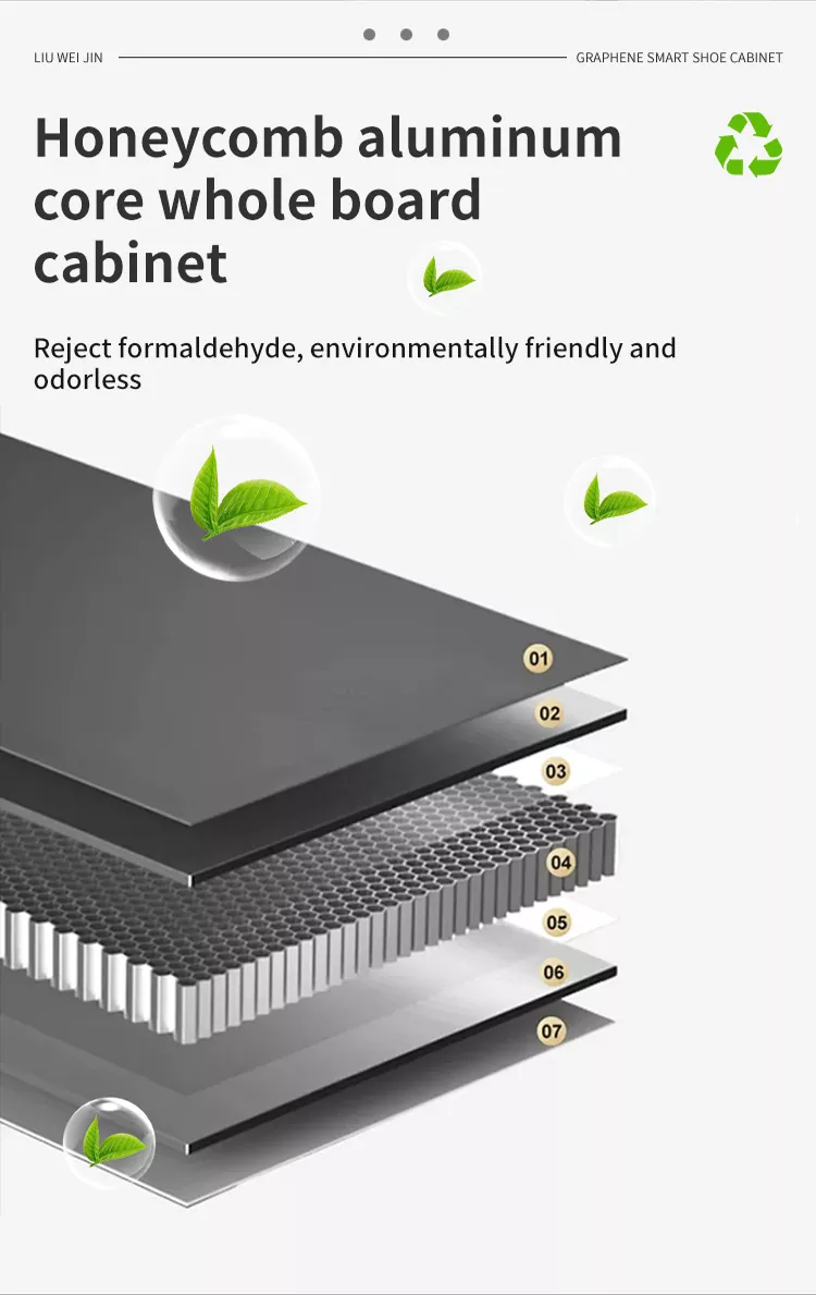 See Liuwei Jinshi grafeeni elektrilise kuumutamise ajastuse kuivatamise kingakapp kasutab intelligentse ajastuse toetamiseks grafeeni kütteelementi ja alumiiniumkapi korpust. Suurus on kohandatud ja laminaat on reguleeritav. Grafeeni soojuselement vabastab kaugelt infrapuna valguse, et tõhusalt vastu panna bakteritele, desodoreerida ja kiiresti kuivada. Lisaks on lõhnade kõrvaldamiseks ioonide puhastusmoodul.