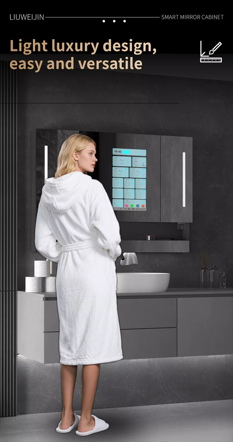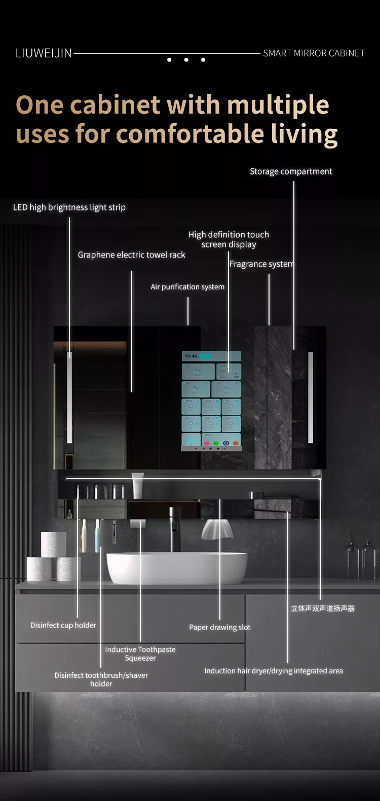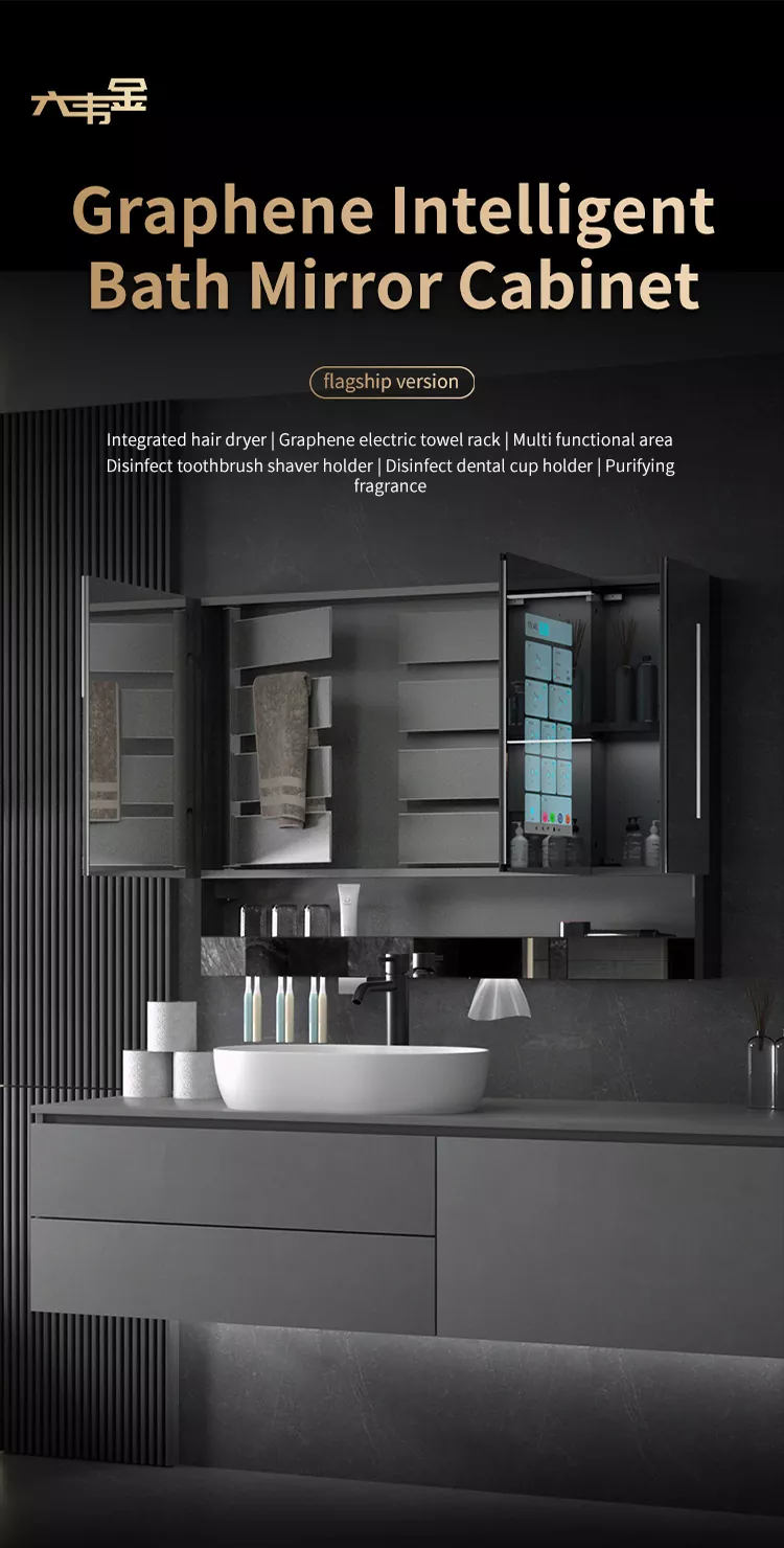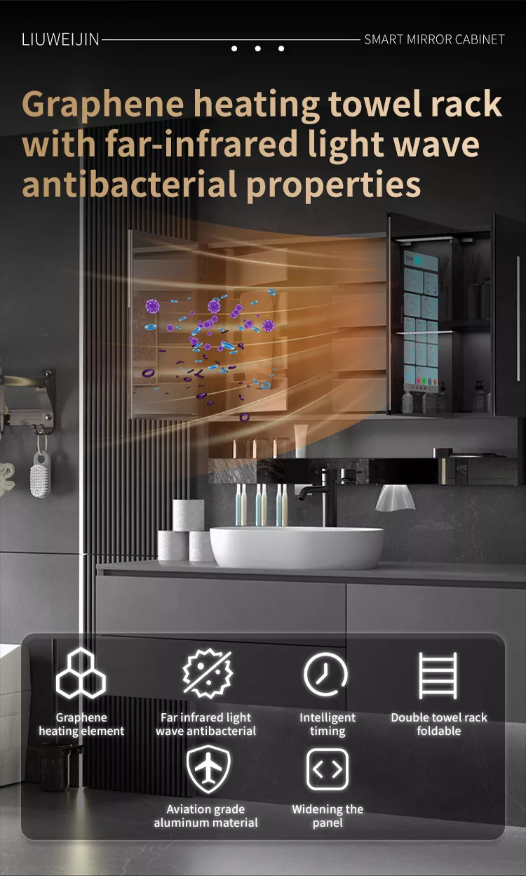 See Liuwei Jinshi Grafeeni nutika vannipeegli kapp on valmistatud sulami materjalist, mis on vastupidav ja niiskusekindel. LED-heleda riba, automaatne hambapasta pigistamismasin, hammaste tassi tühjendusreeg, hammaste tassi hammaste harja ultraviolett-desinfitseerimisseade, torude kuivat seade, torustikku kuivat seadet, torustikku kuivat seadet. ekraan, induktsiooni käte desinfitseerija, peegelkatte süsteem, Chengi tüüpi juhtimiskeskus. Luksusmudel on varustatud grafeenkütte ja kuivatamise rätikuraami, intelligentse lõhnasüsteemi ja õhupuhastussüsteemiga. Lisaks toetab suur ekraan oma elu rikastamiseks heli- ja video meelelahutust, ilmastiku- ja aja kuvamist, rakenduste allalaadimist jne.