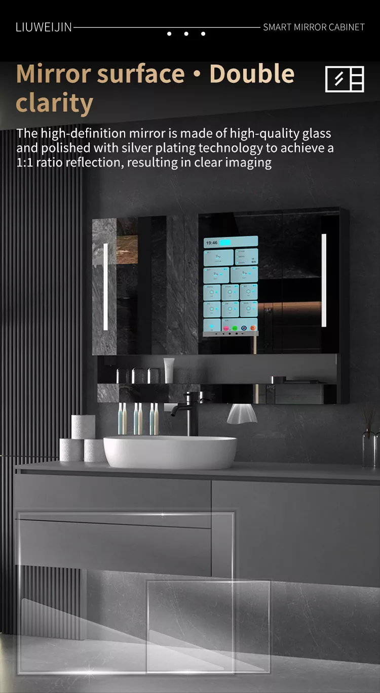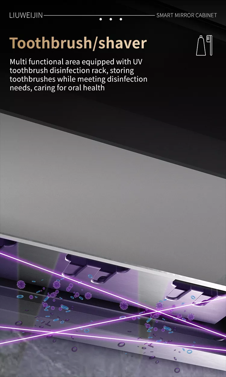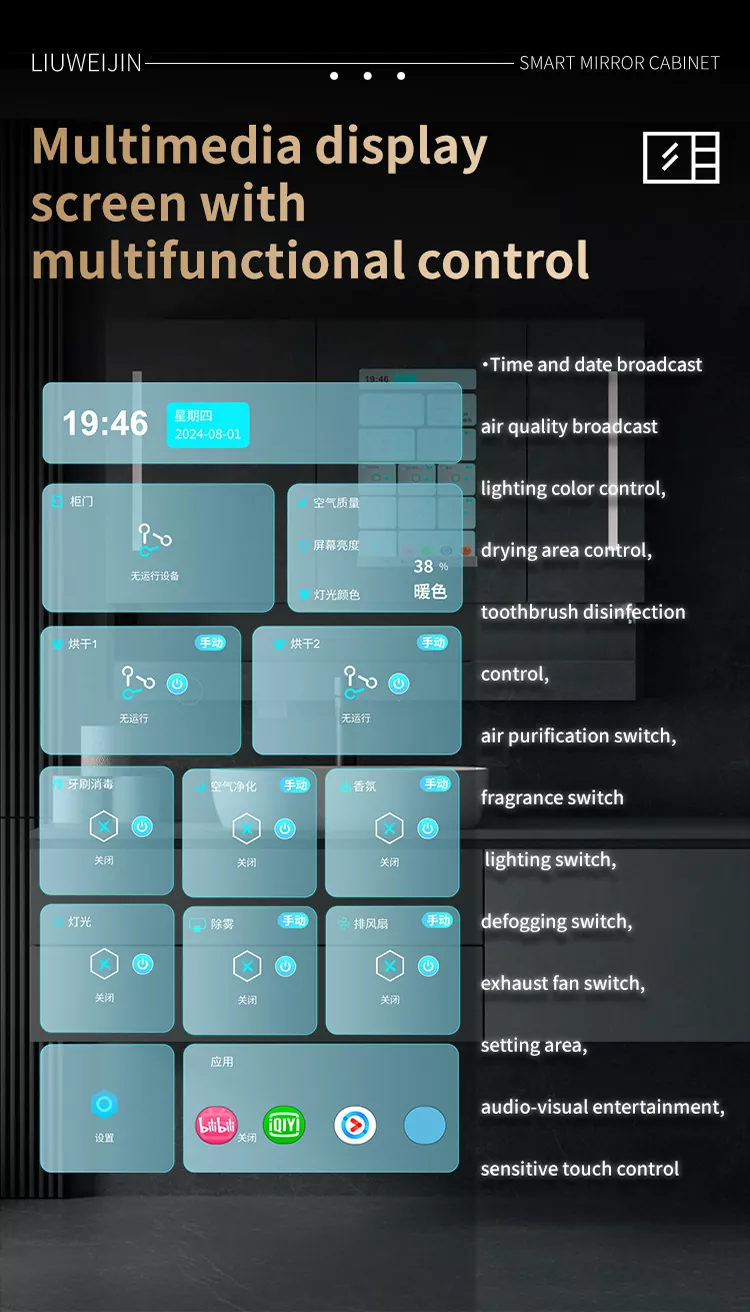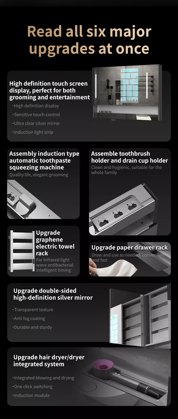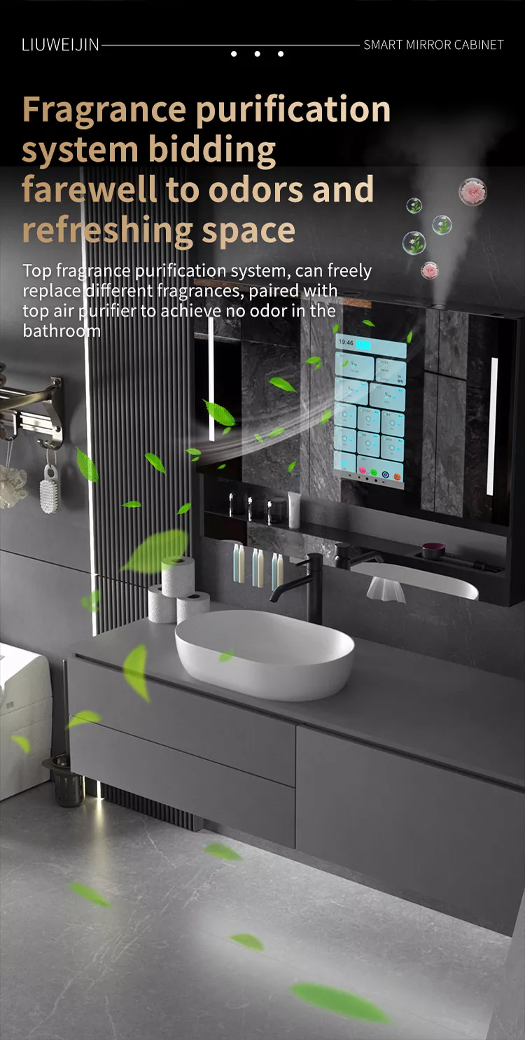 See Liuwei Jinshi Grafeeni nutika vannipeegli kapp on valmistatud sulami materjalist, mis on vastupidav ja niiskusekindel. LED-heleda riba, automaatne hambapasta pigistamismasin, hammaste tassi tühjendusreeg, hammaste tassi hammaste harja ultraviolett-desinfitseerimisseade, torude kuivat seade, torustikku kuivat seadet, torustikku kuivat seadet. ekraan, induktsiooni käte desinfitseerija, peegelkatte süsteem, Chengi tüüpi juhtimiskeskus. Luksusmudel on varustatud grafeenkütte ja kuivatamise rätikuraami, intelligentse lõhnasüsteemi ja õhupuhastussüsteemiga. Lisaks toetab suur ekraan oma elu rikastamiseks heli- ja video meelelahutust, ilmastiku- ja aja kuvamist, rakenduste allalaadimist jne.