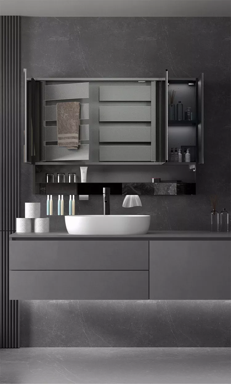 Sisseehitatud rätikraam võtab kasutusele grafeeni kütteelemendi, mis mitte ainult ei suuda rätikut kiiresti kuivatada, vaid ka grafeeni enda kaugeltkiirgusega valguselaine, mis on kasulik inimkehale, saab steriliseerida ja desodoreerida rätikuid. Juuksekuivati riiuli saab ühendada sisseehitatud pistikupesa kaudu ja juhtida välise lüliti abil Automaatne hambapasta pigistusmasin ja hambaharja tassi ultraviolettkiirguse desinfitseerimisseade muudavad pesemise lihtsaks, ohutuks ja rahustavaks ning kaitsta kogu pere tervist. Kui olete endiselt mures vannitoa niiske lõhna pärast, on sellel tootel sisseehitatud õhupuhastussüsteem ja aroommoodul. Tegelikult eemaldage see tualettruumi lõhna.